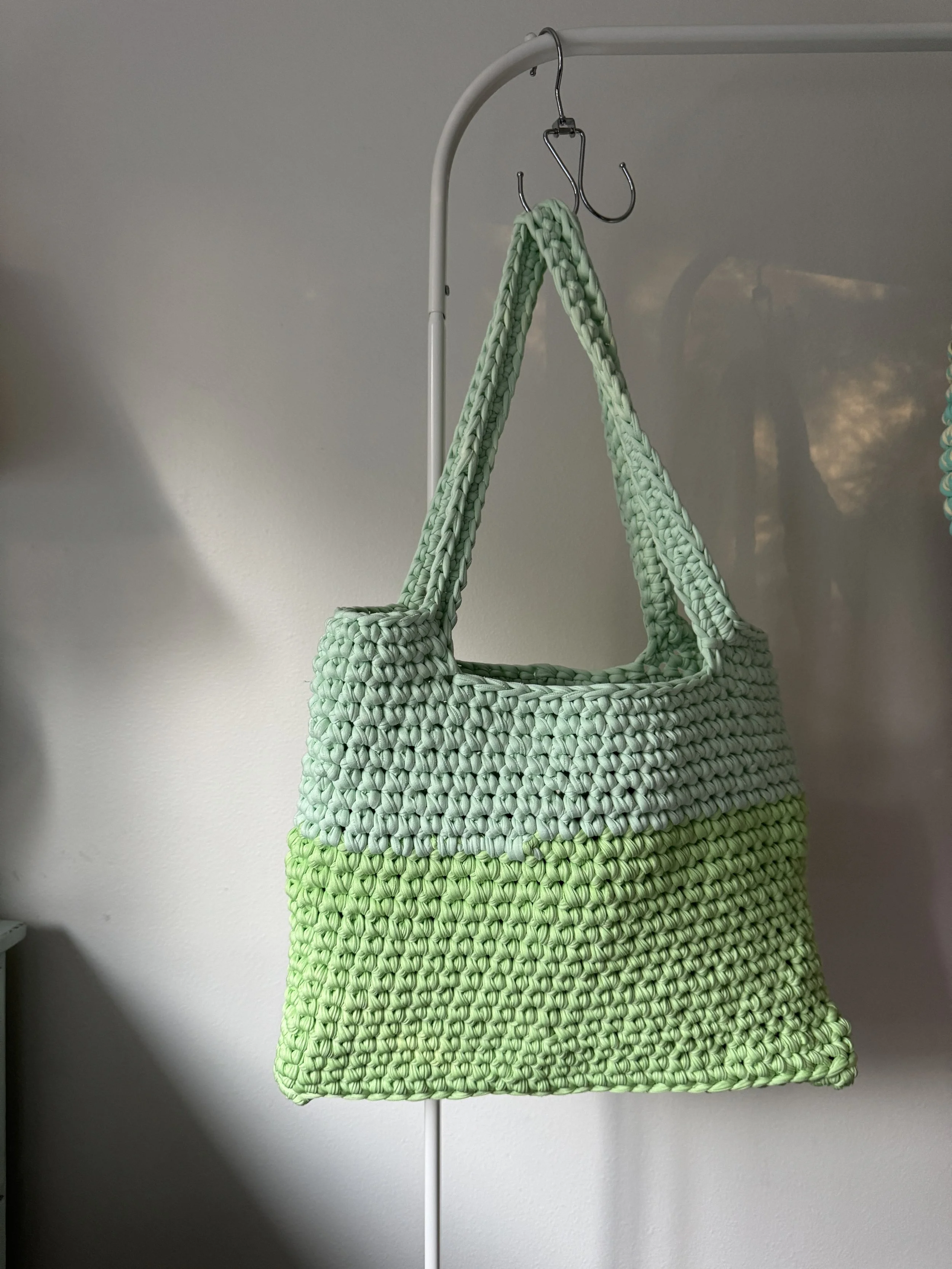 This is our tote bag made from recycled T-shirt yarn! This tote bag is great for on the go or a work bag. I am able to fit all my work stuff in this bag, along with my 40oz owala